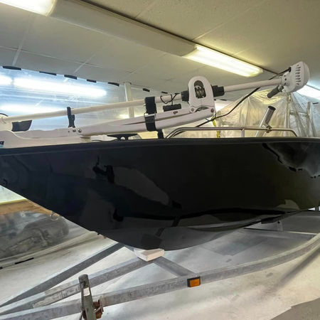 We took this boat in after starboard side scarring. We repainted the hull and had the factory decals remade and installed.